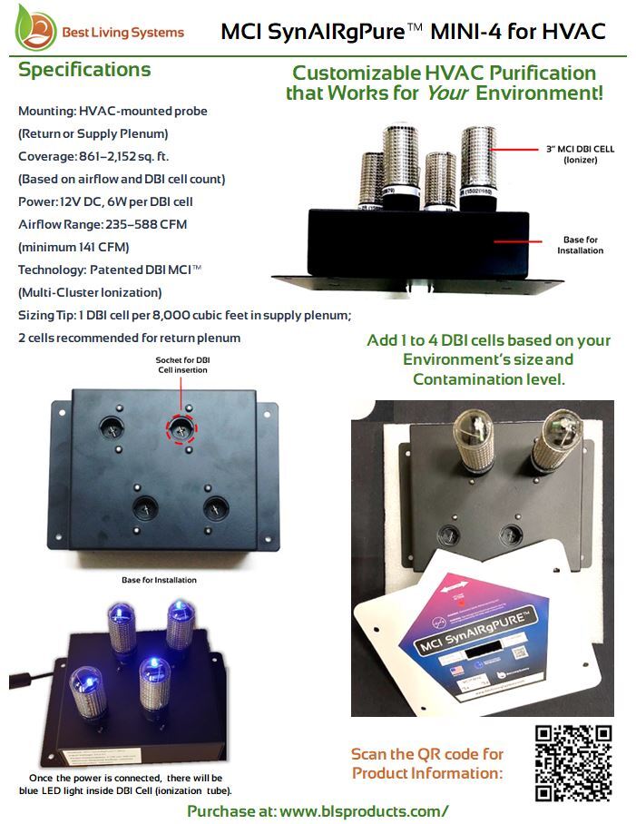 This MCI™ SynAIRgPure MINI induct probe includes 2 DBI cells and is effective against a wide range of contaminants in both the air and on surfaces. Customizable HVAC Purification That Works for Your Environment Looking for a smarter way to purify your indoor air? The MCI™ SynAIRgPure™ Mini-4 is a fully customizable HVAC-mounted probe that delivers powerful, proactive air and surface purification—right through your existing ductwork. With the ability to add up to 4 DBI cells, this system gives you the flexibility to scale purification power based on your space, air quality needs, and contaminant load. Whether you're managing a home, office, or commercial building, the Mini-4 helps you breathe easier—safely and efficiently. Mini4 Spec Sheet Mini4 Owners Manual Features & Benefits Cleaner Air, Healthier Living: Actively destroys mold, mildew, bacteria, viruses, VOCs, and odors—in the air and on surfaces. Custom Fit for Your Space: Add 1 to 4 DBI cells based on your environment’s size and contamination level. Protects Your HVAC System: Helps keep coils and ductwork cleaner, reducing maintenance and improving airflow. Safe & Ozone-Conscious: Delivers powerful purification without the risks of high ozone levels. Set It and Forget It: Long-lasting DBI cells and an up to 3-year recommended replacement schedule mean low maintenance and long-term peace of mind. Ideal For: Homes with pets, carpets, or high occupancy Offices and commercial buildings with high foot traffic Buildings with recent renovations or poor ventilation Allergy-sensitive environments or spaces with odor concerns Specifications Mounting: HVAC-mounted probe (return or supply plenum) Coverage: 861–2,152 sq. ft. (based on airflow and DBI cell count) Power: 12V DC, 6W per DBI cell Airflow Range: 235–588 CFM (minimum 141 CFM) Technology: Patented DBI + MCI™ (Multi-Cluster Ionization) Maintenance: 3-year DBI cell lifespan (recommended) Sizing Tip: 1 DBI cell per 8,000 cubic feet in supply plenum; 2 cells recommended for return plenum EPA No. 87947-LA-2 NOTICE: This product Does not meet California air cleaner regulation (UL 2998) requirements: cannot be shipped to California. For Product Support/Repair: Please file a support ticket or call 1.800.728.7206