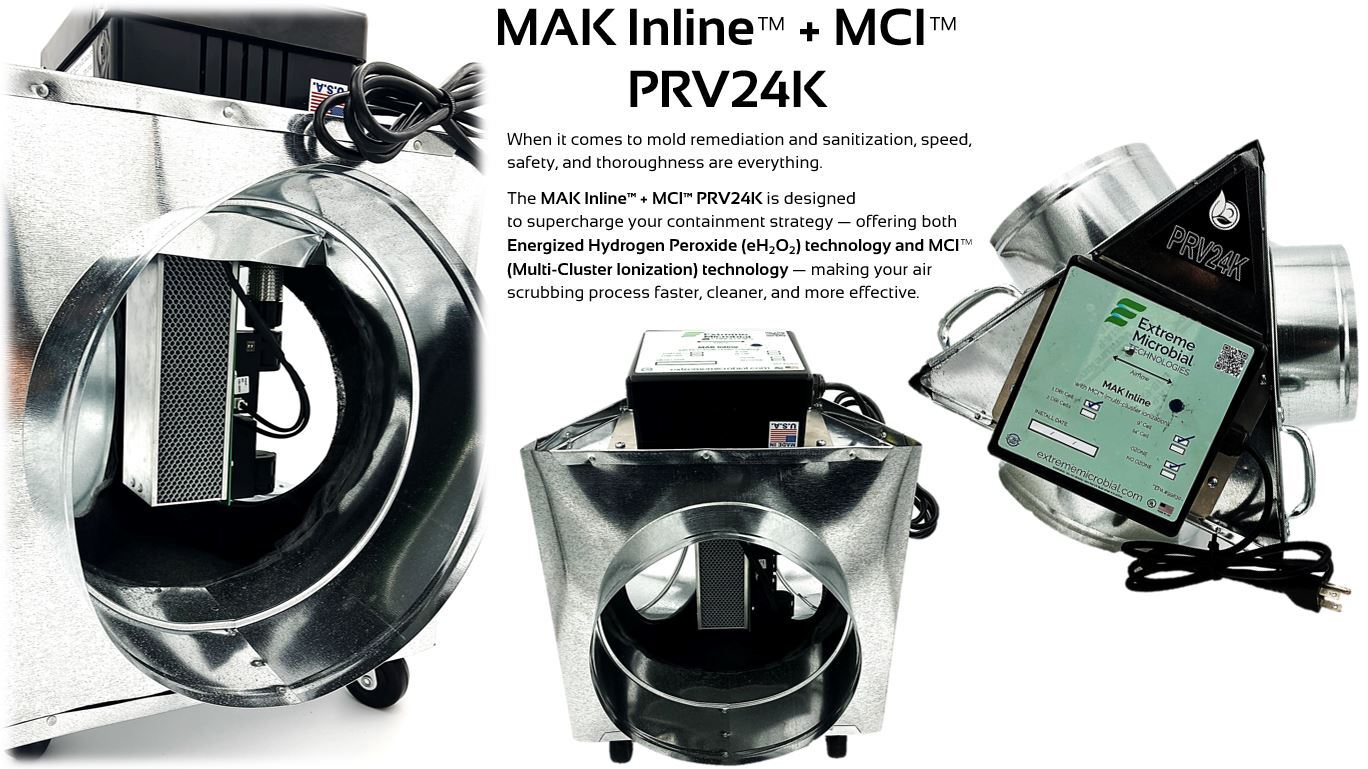 When it comes to mold remediation and sanitization, speed, safety, and thoroughness are everything. The MAK Inline™ + MCI™ PRV24K is designed to supercharge your containment strategy — offering both Energized Hydrogen Peroxide (eH2O2) technology and MCI™ (Multi-Cluster Ionization) technology — making your air scrubbing process faster, cleaner, and more effective.