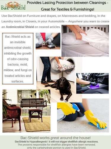 BacShield is intended as a treatment to give antimicrobial and antifungal protection to the treated materials, and inhibits the growth of bacteria, mold, mildew, and fungi that cause odor, stains, discoloration, decay and deterioration of the treated materials. BacShield will make the surfaces easier to clean and keep those surfaces clean much longer than without this treatment.